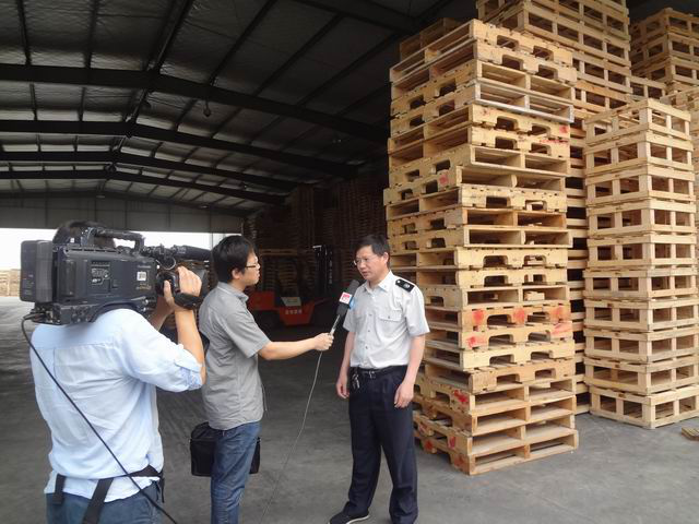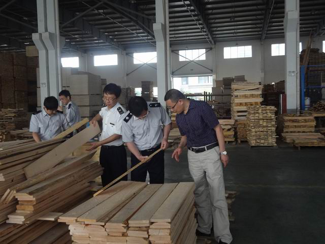 检查组在车间抽查疫木板材的加工质量。